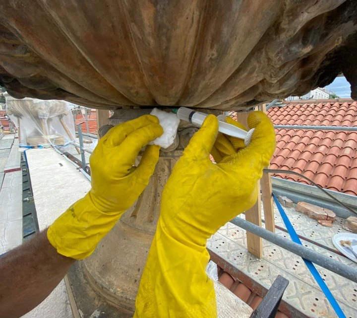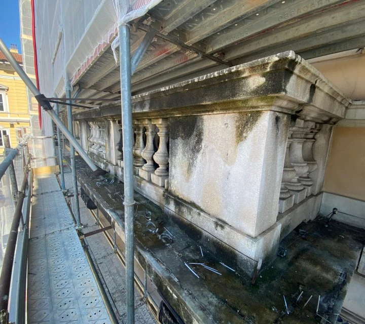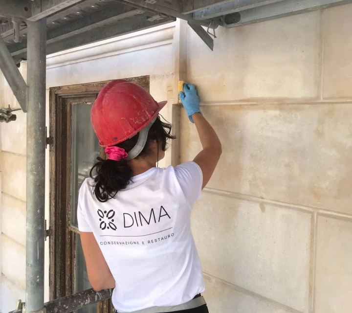 Intervento mediante acqua calda a bassa pressione e impacchi con polpa di carta e carbonato d’ammonio per la rimozione controllata di croste nere e patine aderenti.