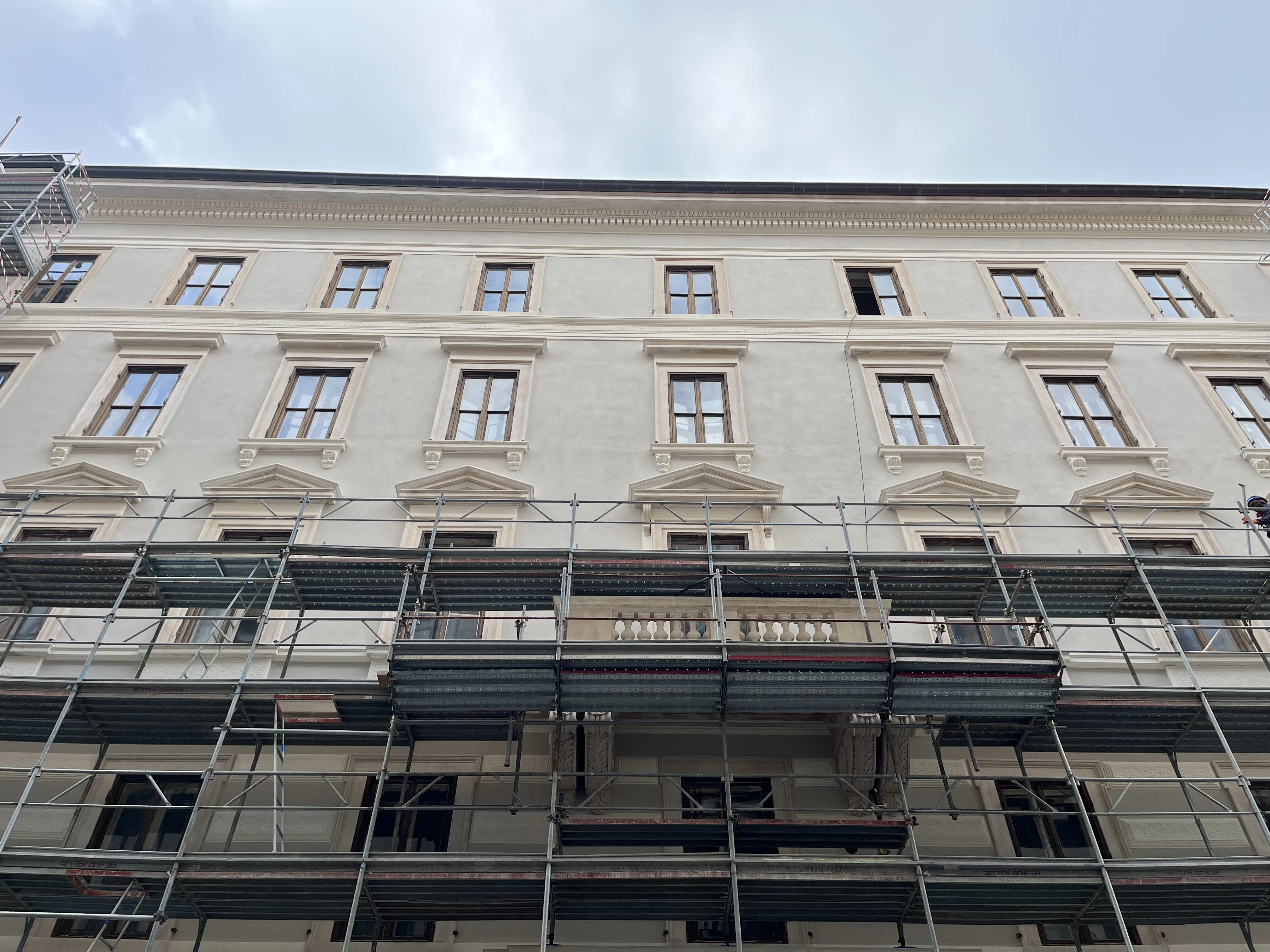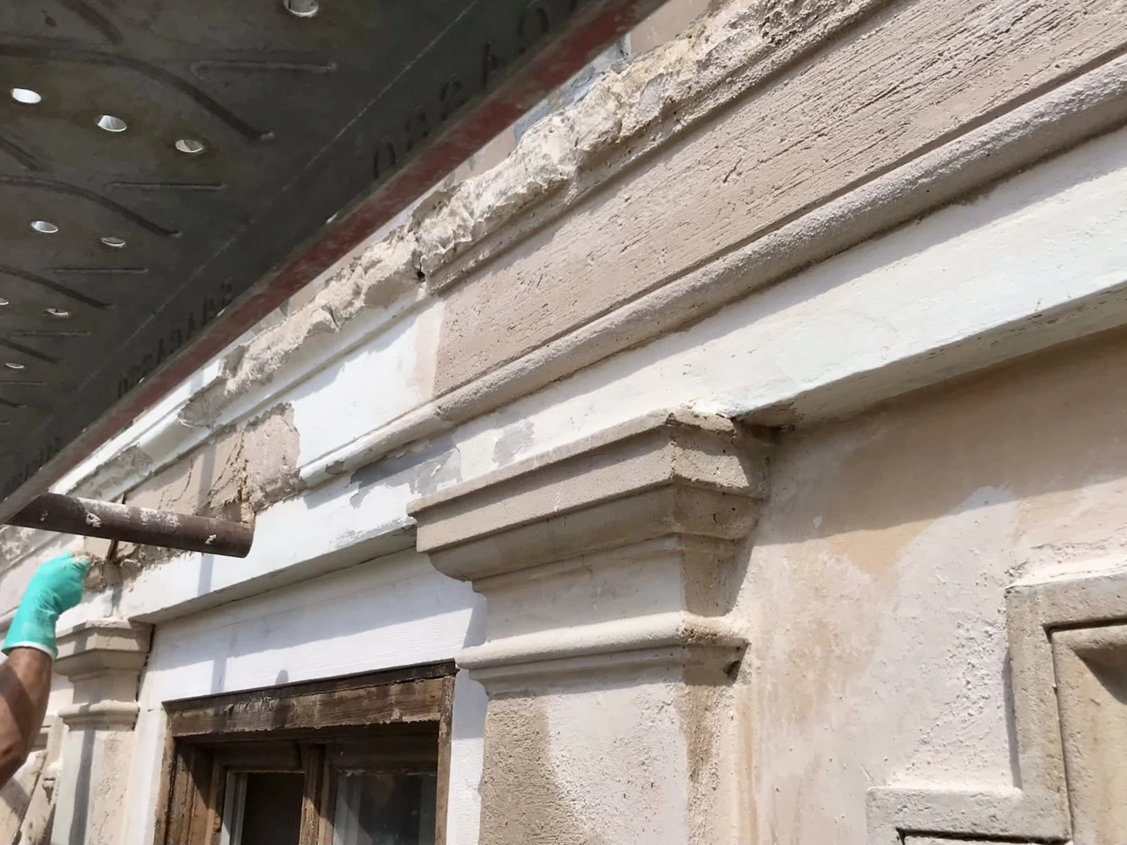 Ripristino delle lacune con malte confezionate in situ (calce, polvere di marmo e sabbia selezionata) e ricostruzione fedele degli elementi decorativi tramite modine e calchi.