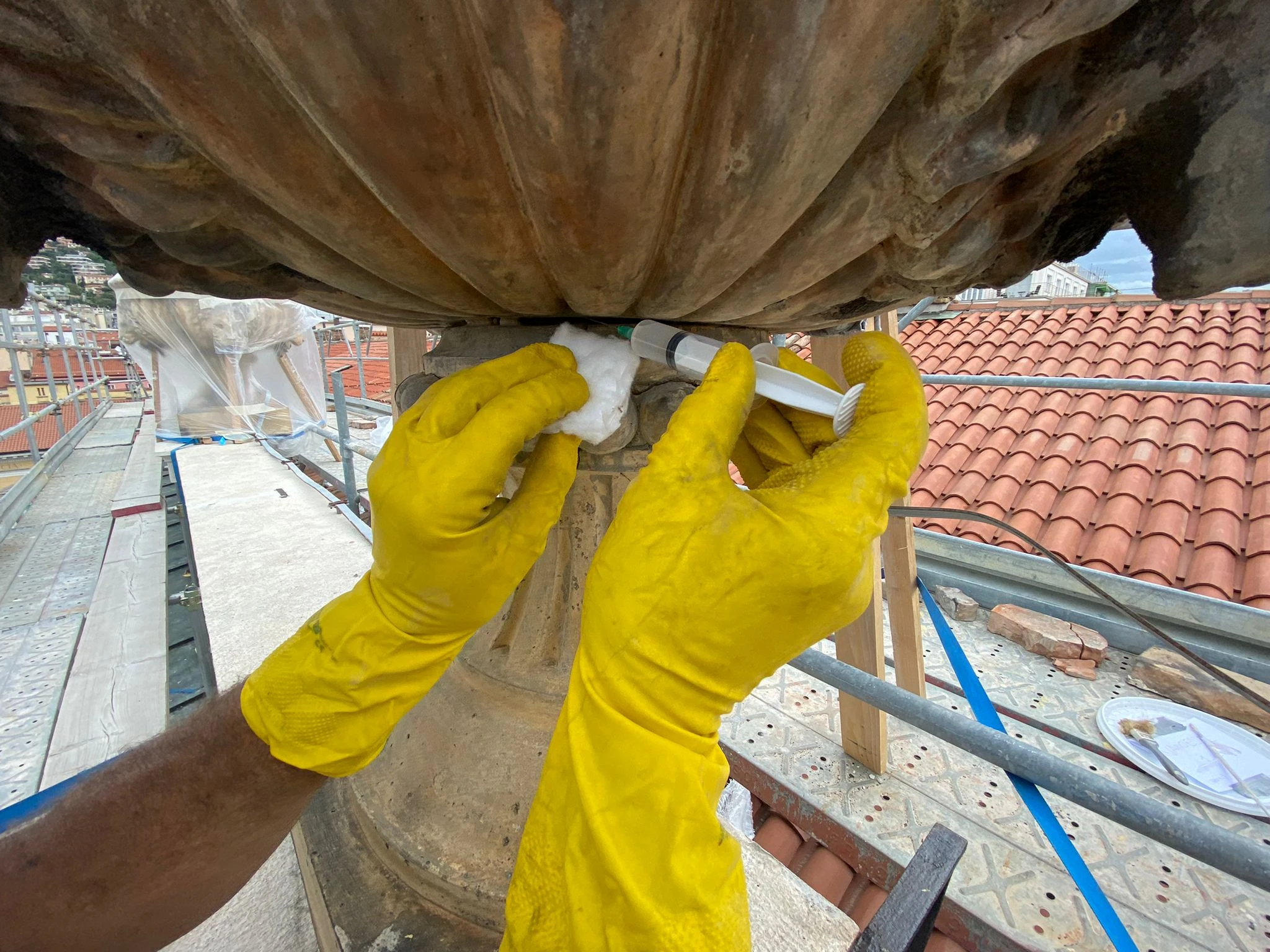 Applicazione di silicato di etile per il consolidamento superficiale e inserimento di perni in fibra di carbonio (15–20 cm) per ristabilire il collegamento tra intonaco, pietra e muratura sana.