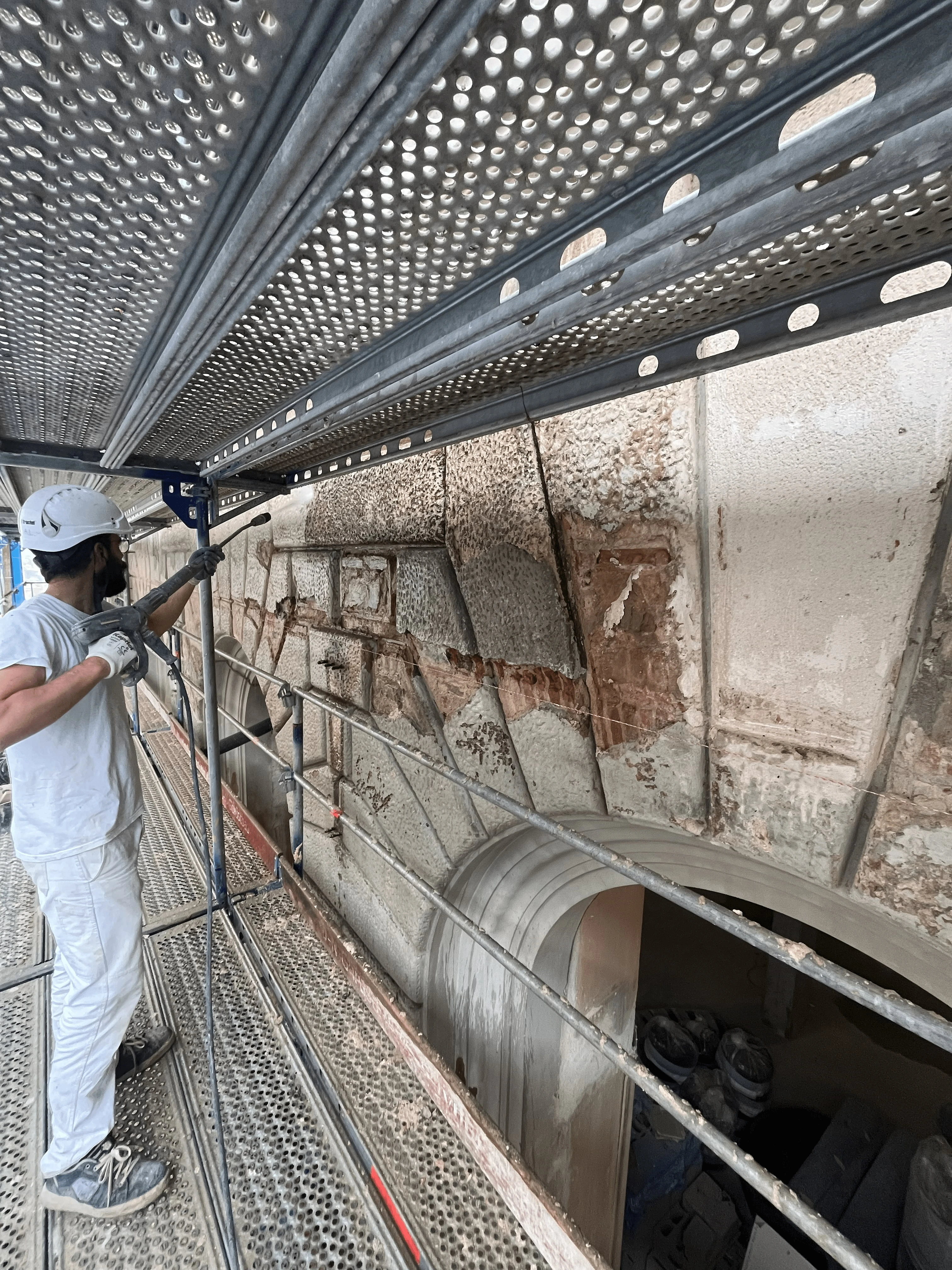 Intervention using low-pressure hot water and poultices with paper pulp and ammonium carbonate for the controlled removal of black crusts and adherent patinas.