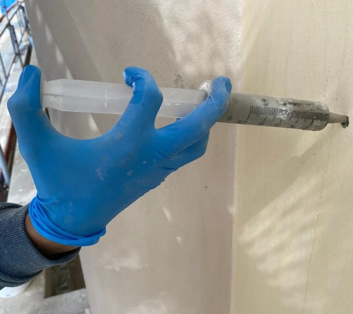 Application of ethyl silicate for superficial consolidation and insertion of carbon fiber pins (15–20 cm) to restore the connection between plaster, stone, and sound masonry.
