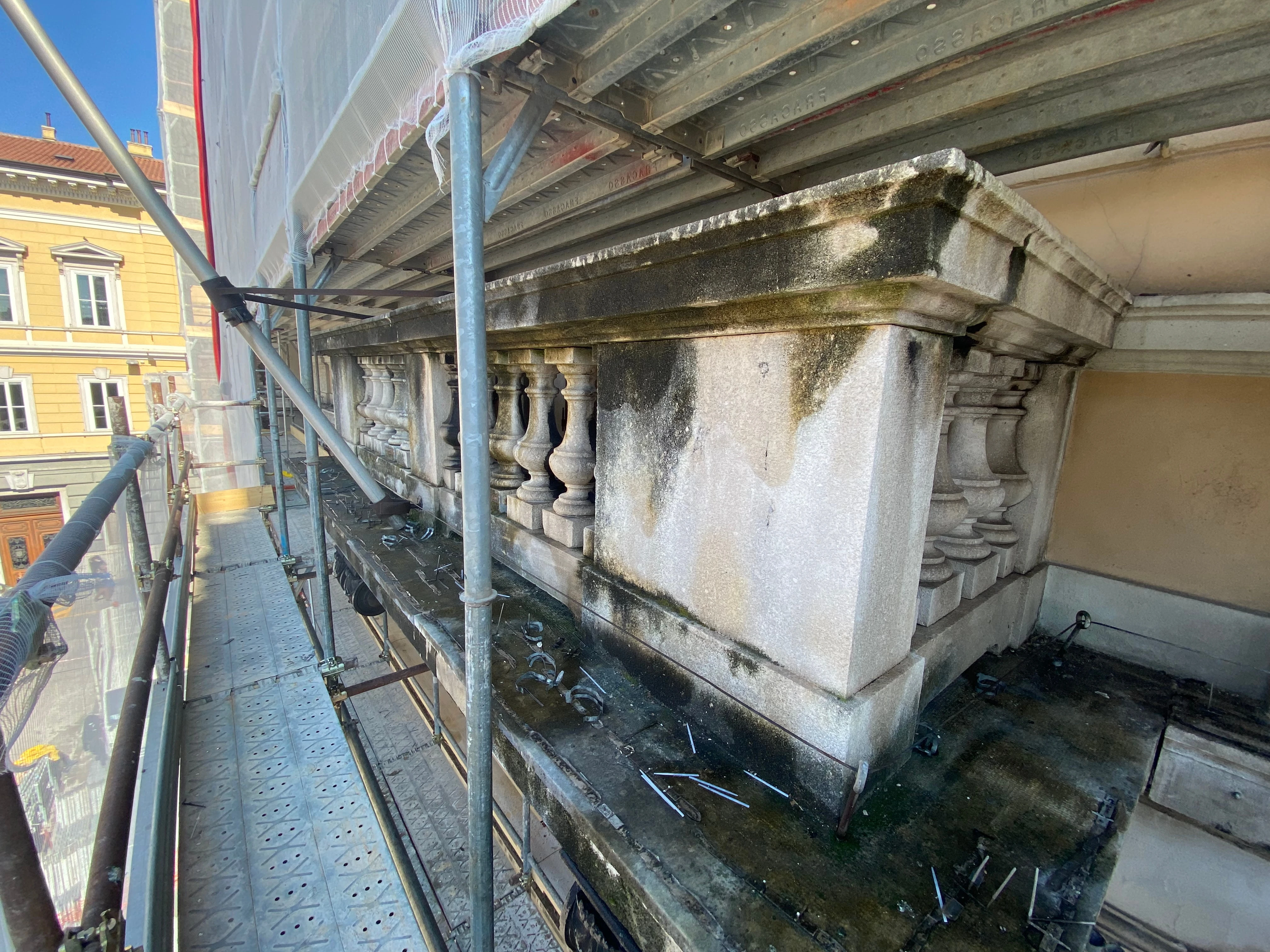 Applicazione di silicato di etile per il consolidamento superficiale e inserimento di perni in fibra di carbonio (15-20 cm) per ristabilire il collegamento tra intonaco, pietra e muratura sana.