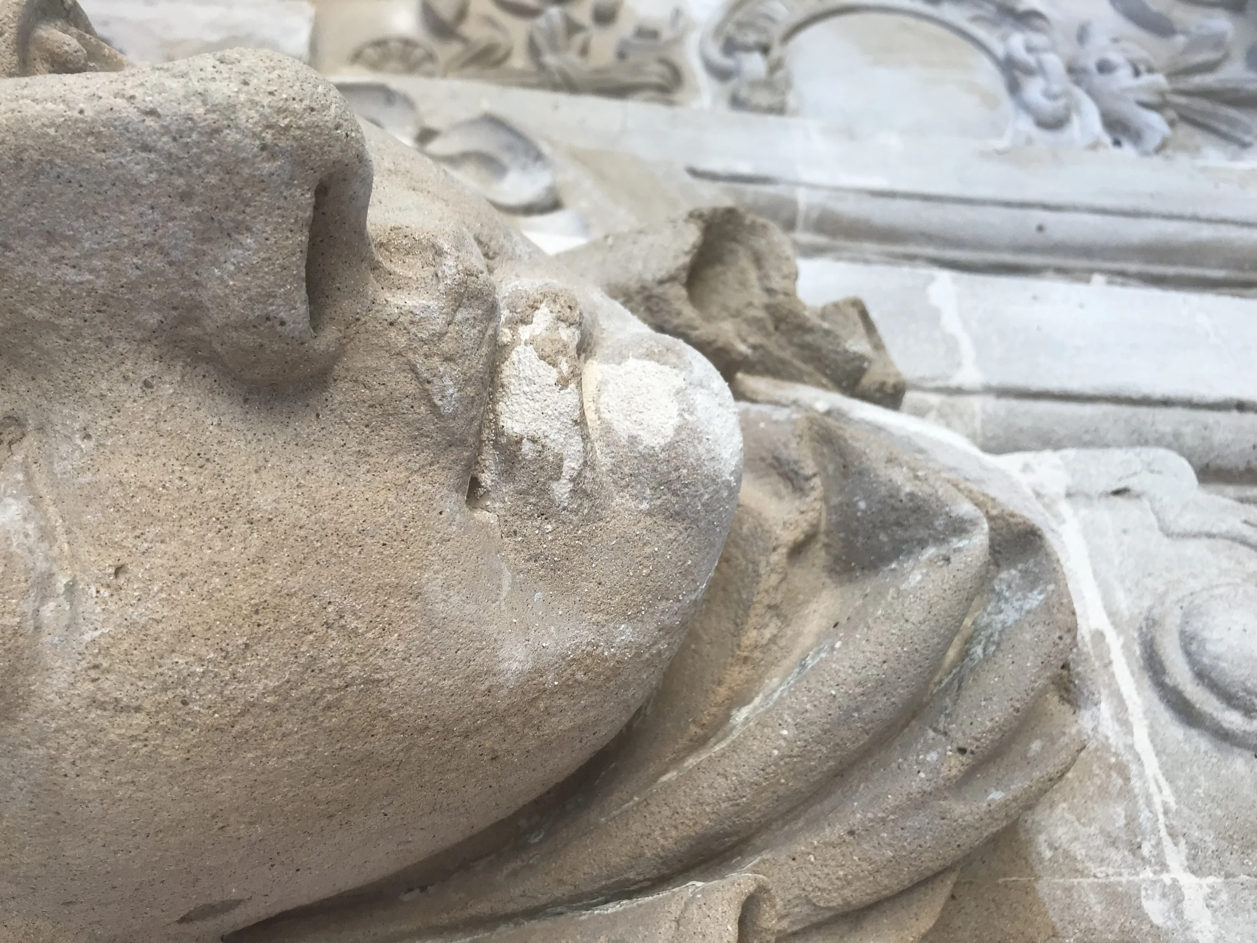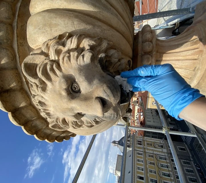 - Rimozione delle porzioni di intonaco fortemente decoese e distaccate e successiva stuccatura di fessurazioni e lacune, mediante l’utilizzo di una malta con granulometria e colore simile all’originale.