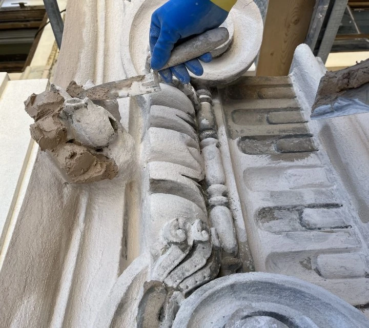 - Consolidamento delle cornici in pietra delle finestre fortemente compromesse mediante inserimento di perni d’acciaio e successiva applicazione di prodotto