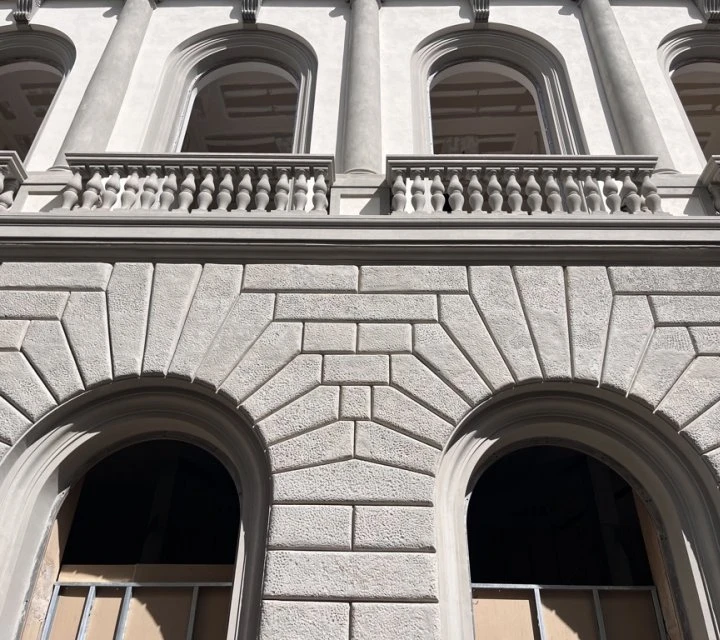 Applicazione a velatura in due riprese per garantire traspirabilità, uniformità cromatica e durabilità dell'intervento. In particolare, nella fascia in finto bugnato, realizzata a imitazione della pietra (pietra arenaria), la velatura ai silicati è stata eseguita con specifica modulazione cromatica e materica al fine di ricreare l'effetto visivo della pietra naturale, valorizzando la resa plastica e l'articolazione dei conci simulati.