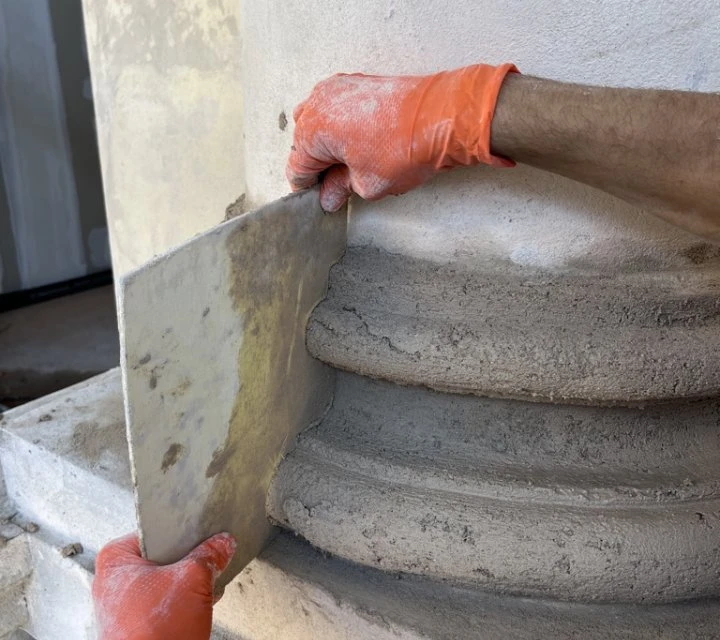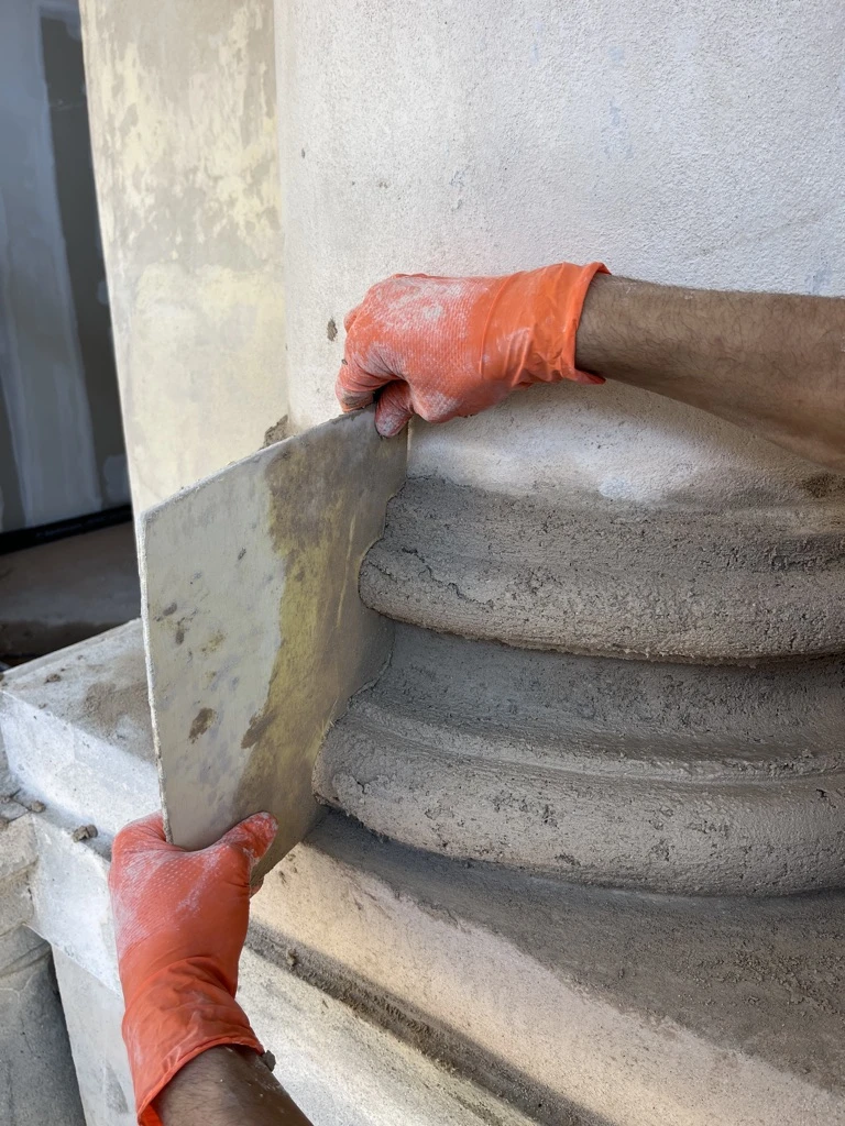 Ripristino delle lacune con malte confezionate in situ (calce, polvere di marmo e sabbia selezionata) e ricostruzione fedele degli elementi decorativi tramite modine e calchi.