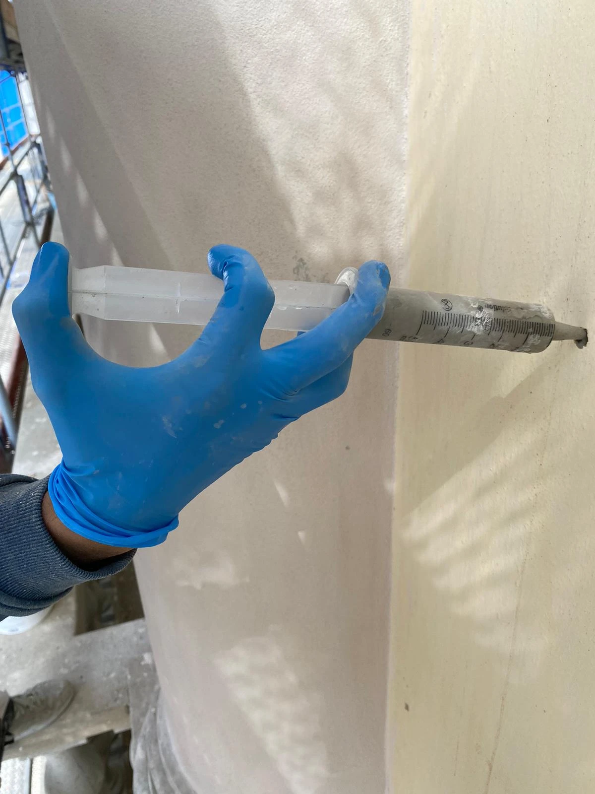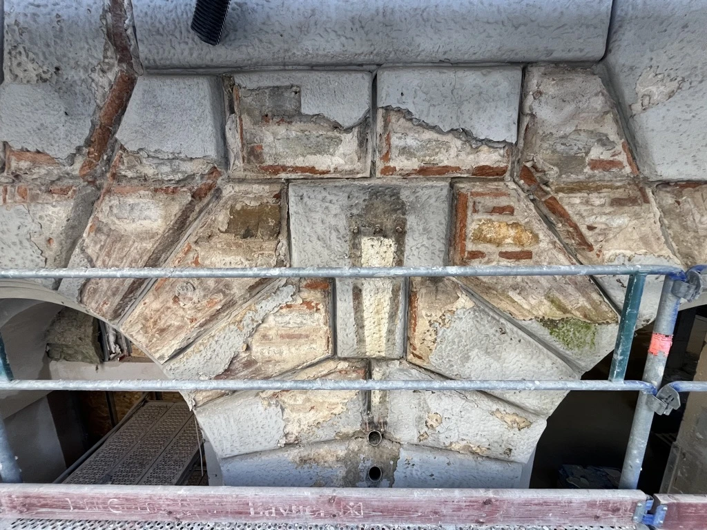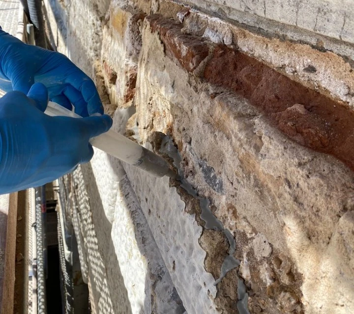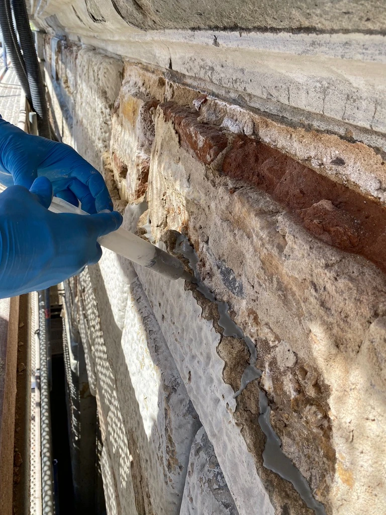 Applicazione di silicato di etile per il consolidamento superficiale e inserimento di perni in fibra di carbonio (15-20 cm) per ristabilire il collegamento tra intonaco, pietra e muratura sana.