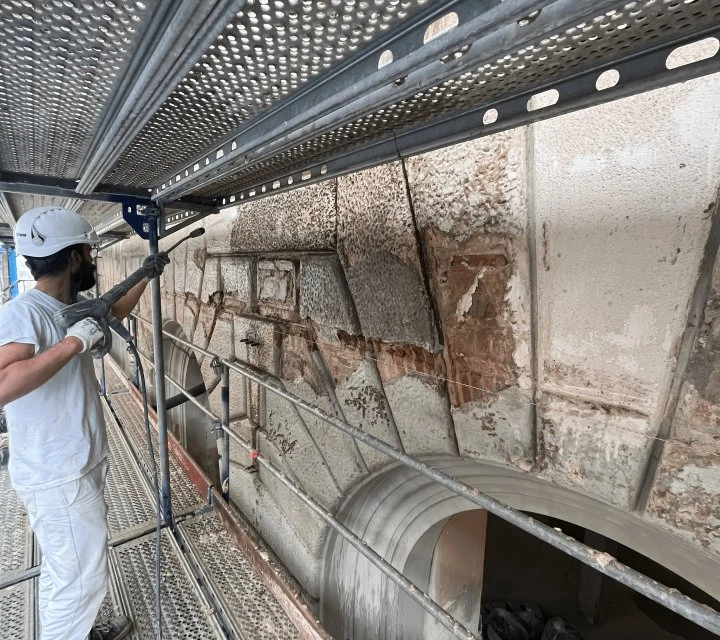 Intervento mediante acqua calda a bassa pressione e impacchi con polpa di carta e carbonato d'ammonio per la rimozione controllata di croste nere e patine aderenti.